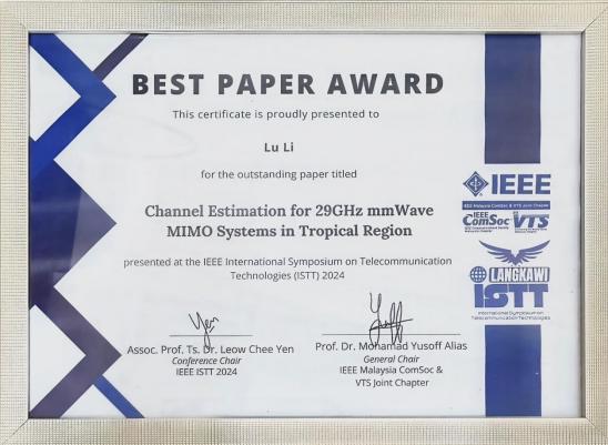 公司教师鲁力博士在ISTT 2024上凭借其论文《Channel Estimation for 29GHz mmWave MIMO Systems in Tropical Region》获得了“最佳论文奖”,这一荣誉标志着他在高频毫米波通信技术研究中的创新性贡献得到了国际权威认可。该论文的研究聚焦于在热带气候下的毫米波信道估计难题,为未来通信系统的可靠性和精确性提供了有效解决方案。此研究成果不仅推动了毫米波通信技术在复杂环境下的应用,也为相关领域的后续研究提供了宝贵参考。