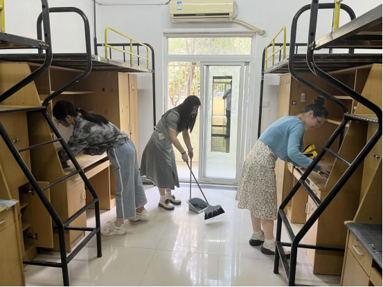 顶着烈日,党员们带着工具早早来到现场,不怕脏、不喊累,不放过任何一个角落,擦拭桌椅、清扫地面、清洁衣柜,有条不紊、认真细致地打扫;同时,还对宿舍水电、门、窗进行了全面排查并做好记录及时上报。在确保新生宿舍的干净整洁后,党员们有序关门离场。