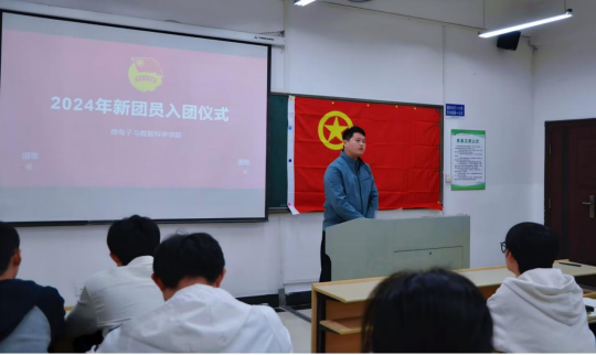 仪式在庄严的国歌声中拉开帷幕。会上,段世祥宣读了2024年下半年新发展团员名单,并为新团员颁发团章、团员证和团徽。新团员们面向团旗庄严宣誓,承诺为共产主义奋斗终身。新老团员代表鲁冬儿和张志国同学在仪式上发言,言语中满是对未来的憧憬以及对自身责任的深刻认知。他们表示将严格遵守团的章程,积极履行团员义务,努力学习、锐意进取,以实际行动践行团员的责任与担当。段世祥向新团员们表示热烈祝贺,并对团员们提出三点希望:一是坚定理想信念,做到思想上入团、行动上入团;二是勤奋学习、增强本领,成为刻苦学习、锐意创新的模范;三是提高服务意识,以实际行动践行团员职责,为团组织增光添彩。